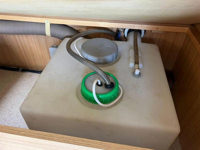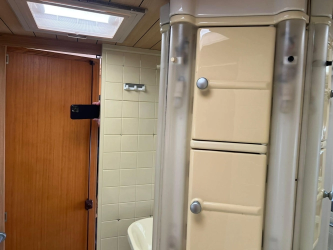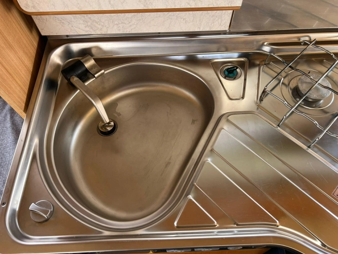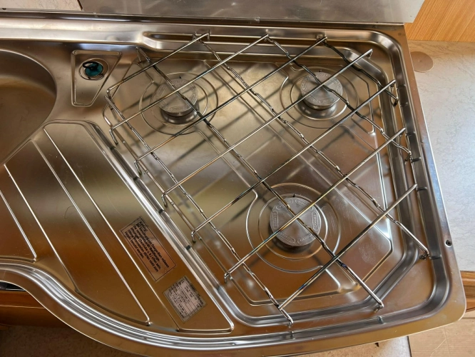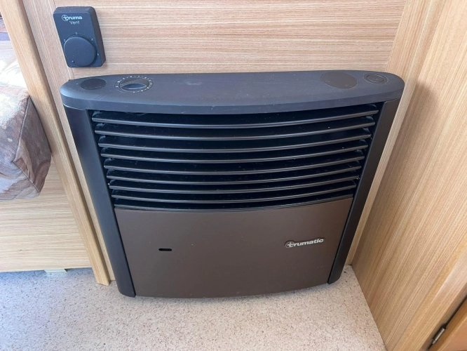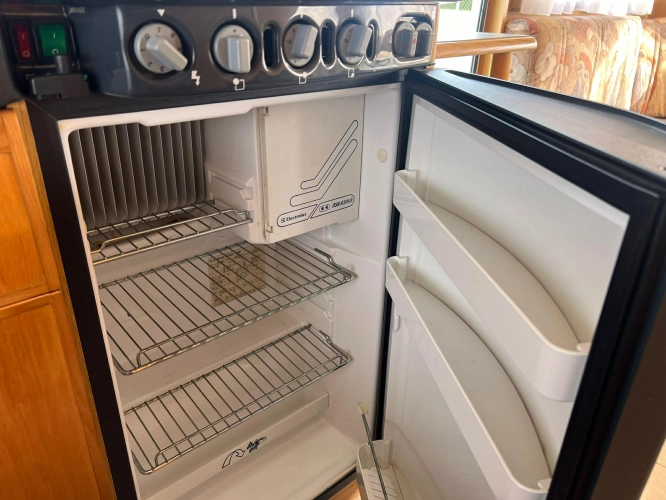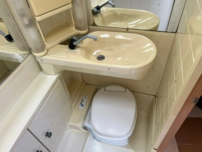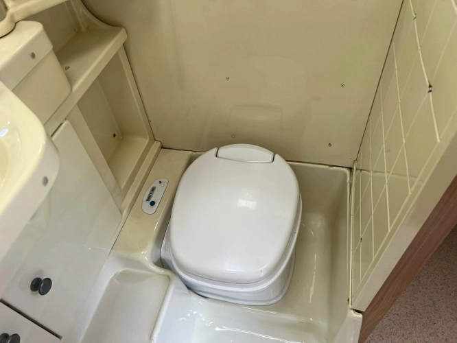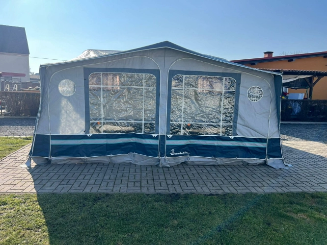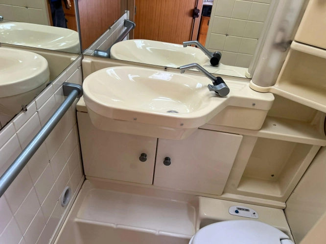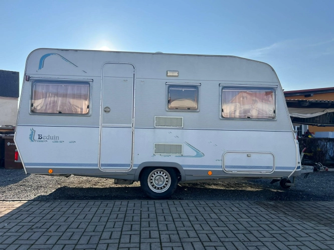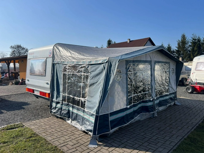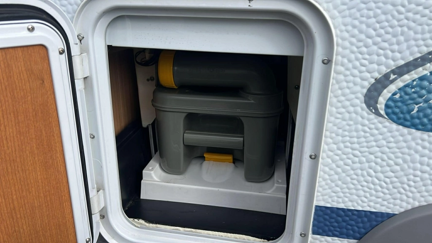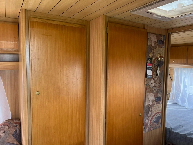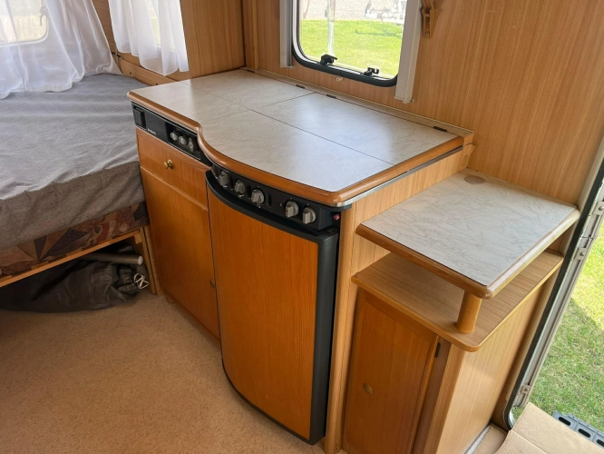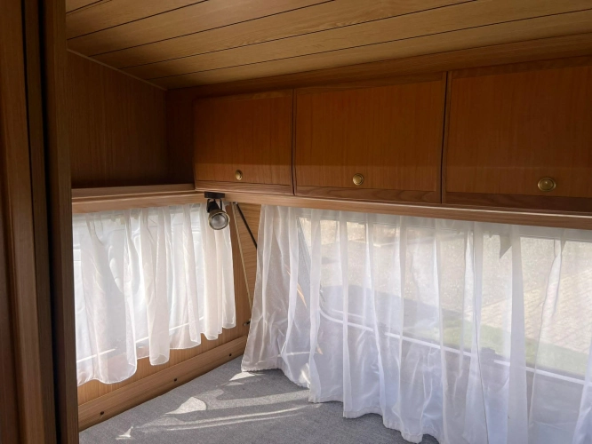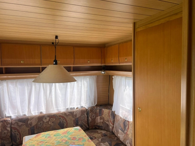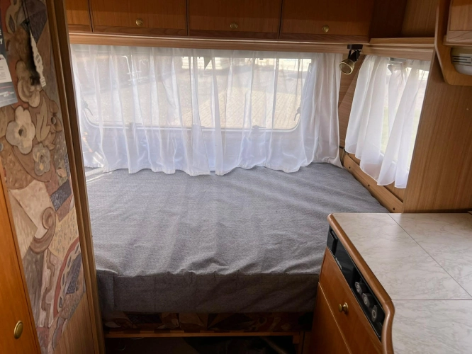 Pevná postel dvoulůžko, koupelna s chemickým wc odtoková vanička, umyvadlo a zrcadla, nerezový dřez, plynový tří plotýnkový sporák, lednice, druhé rozložitelné sezení do písmene U, plynový topení Trumatic, závěsy, záclony, sítě proti hmyzu a thermo rolety v oknech a po celém karavanu mnoho úložného prostoru, předstan.