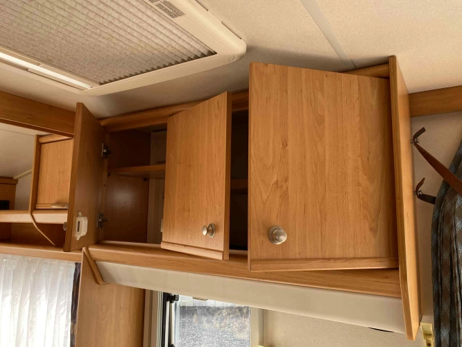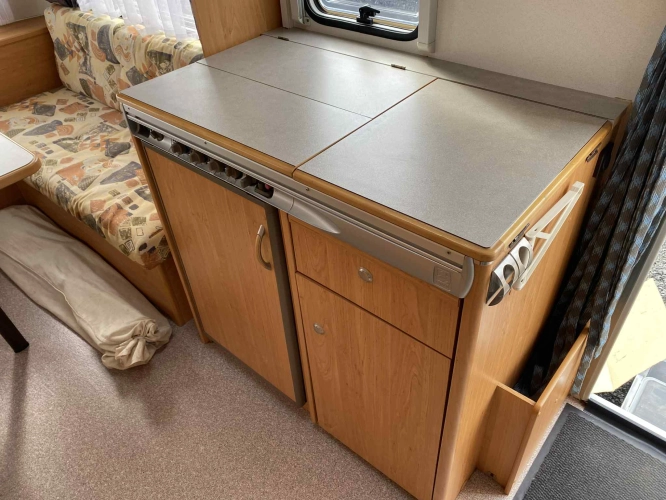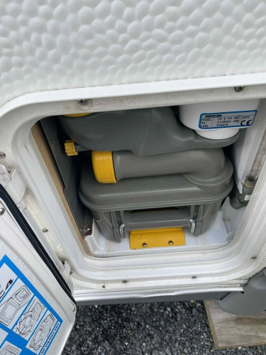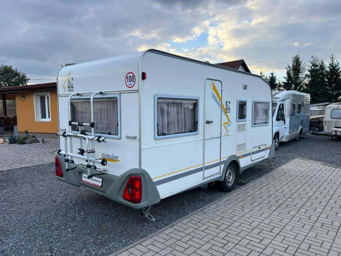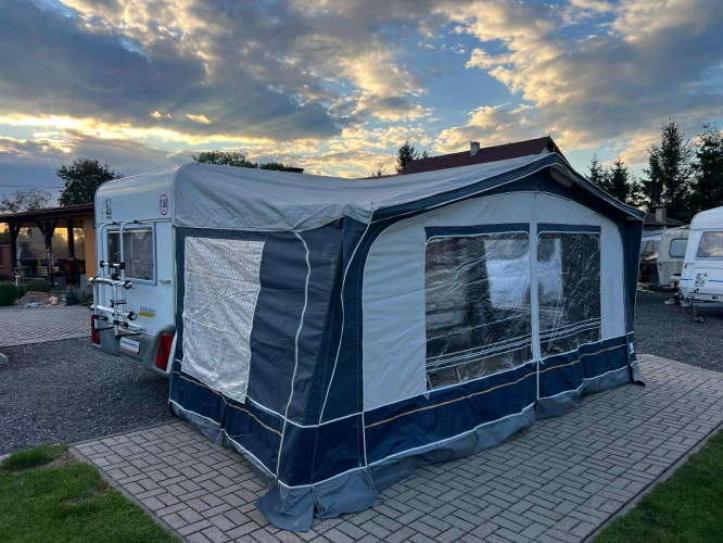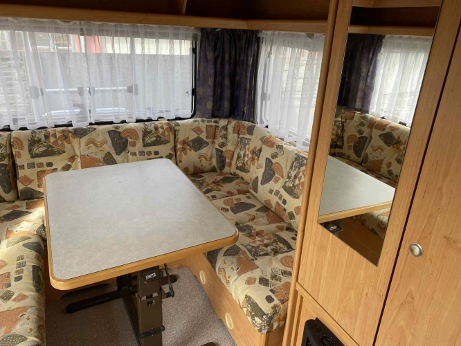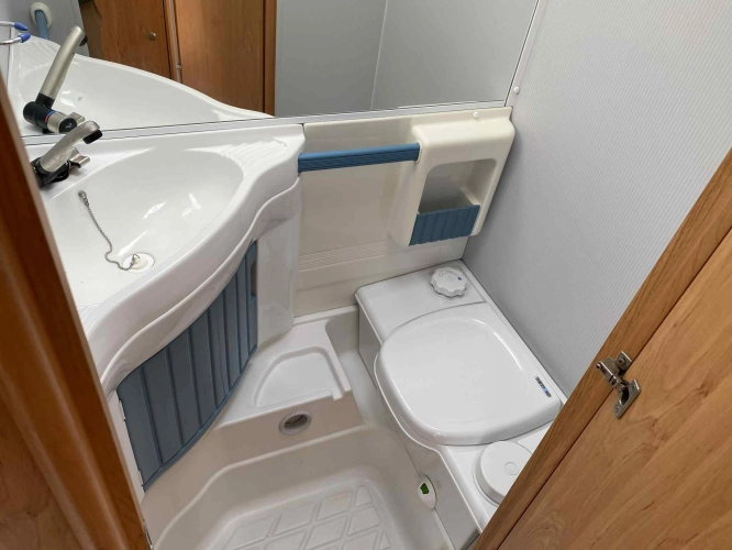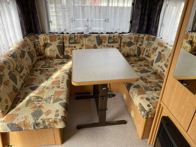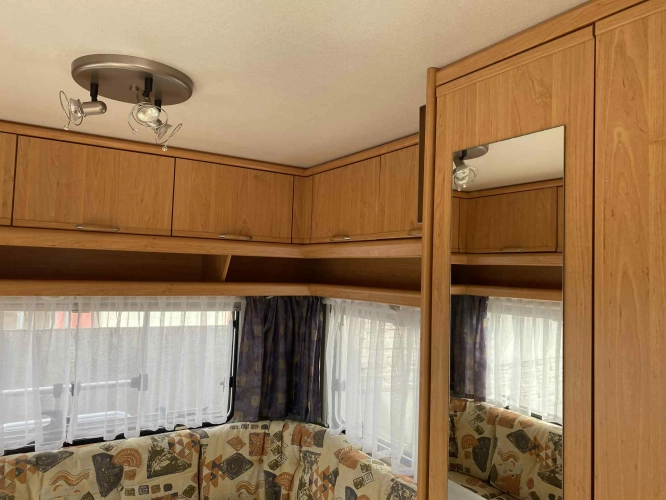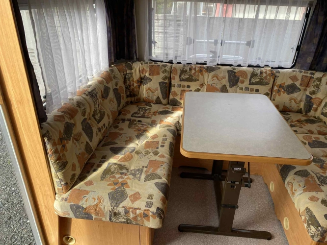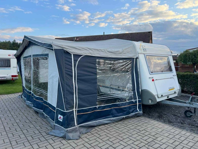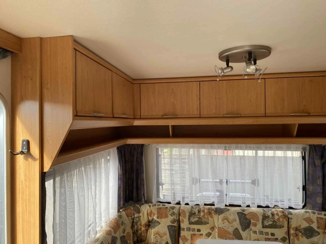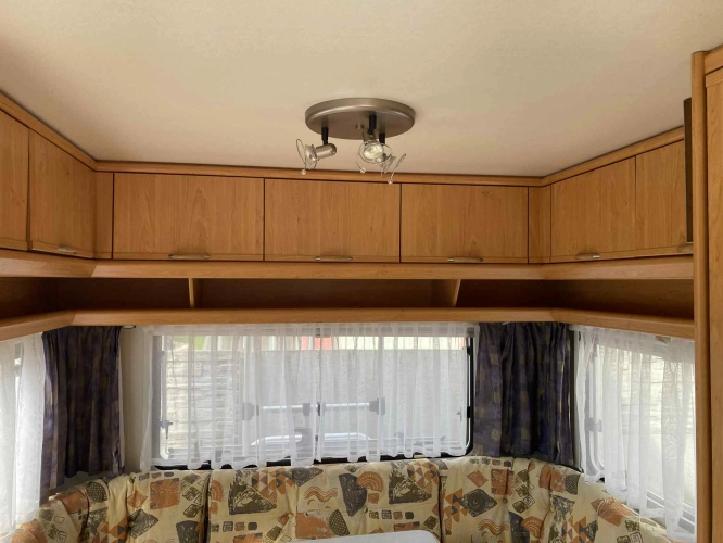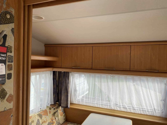 Rozložitelné sezení na dvou lůžko, chemické WC, odtoková vanička, umyvadlo, Tří plotýnkový vařič + dřez, Lednice 220V, 12V, plyn, Plynové topení trumatic, rozfuk, thermorolety v oknech, sítě proti hmyzu, druhé rozložitelné sezení na další dvoulůžko do písmene U, před stan, stabilizátor, stojan na dvě jízdní kola, bojler a mnoho úložného prostoru.