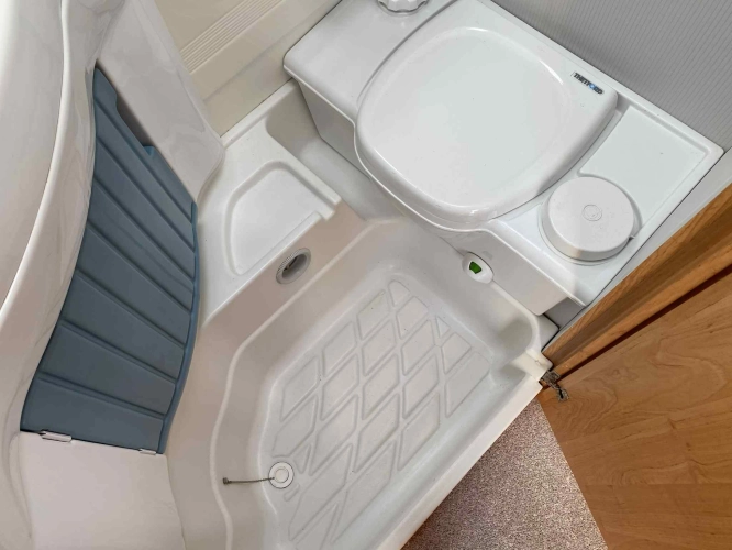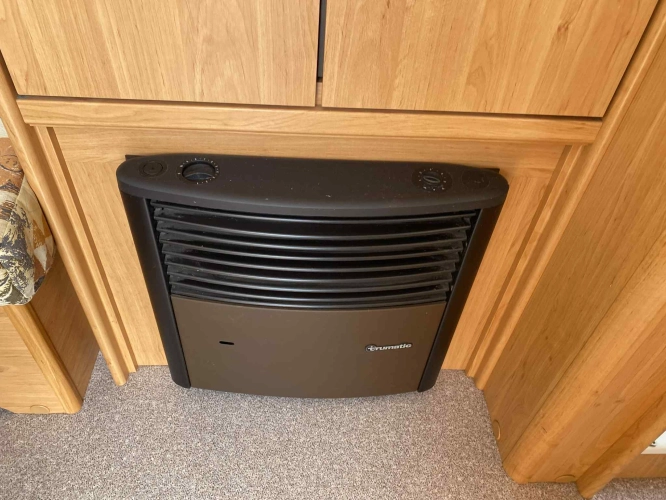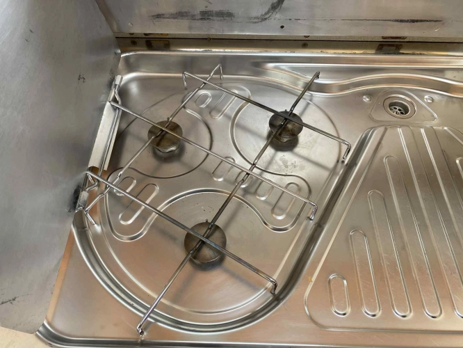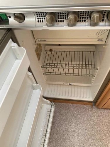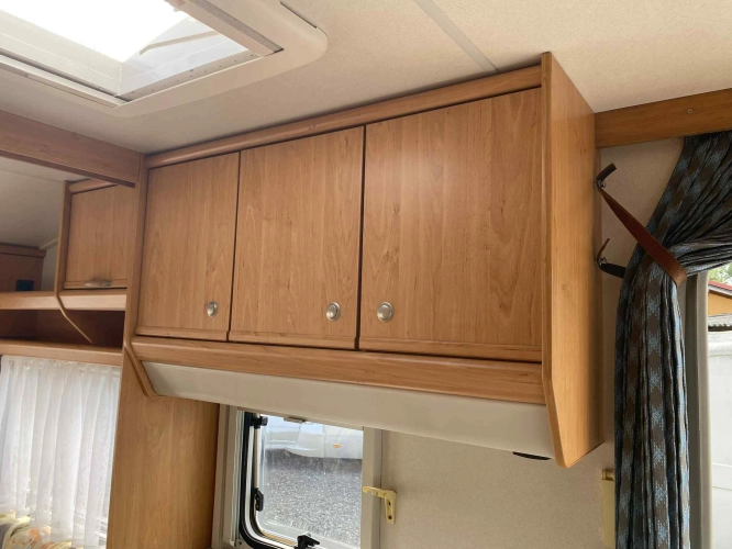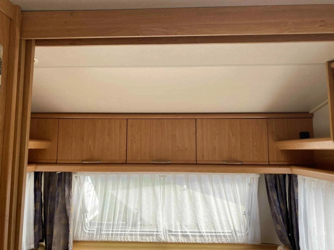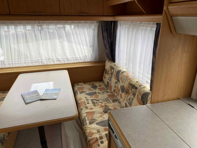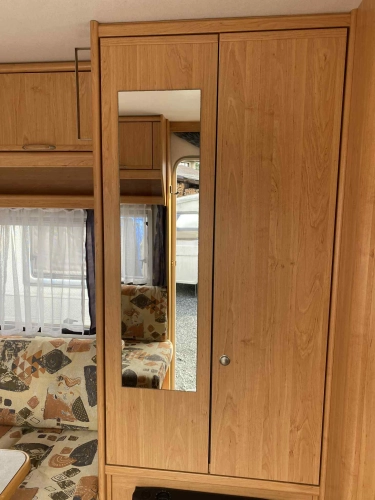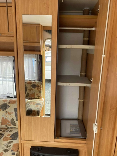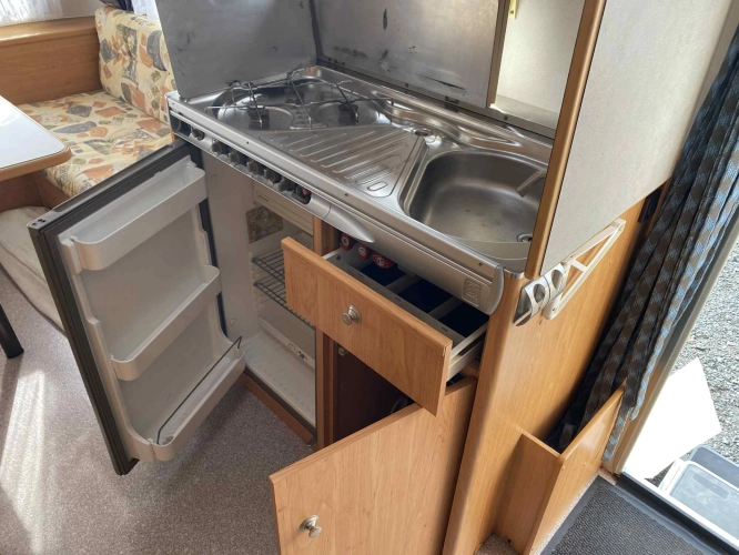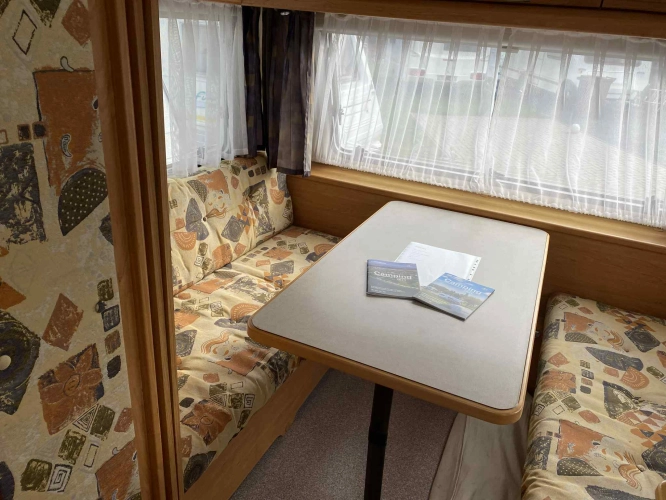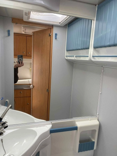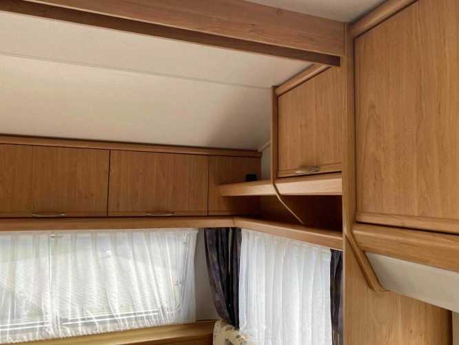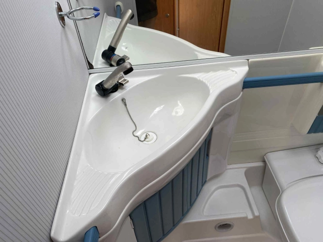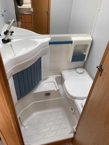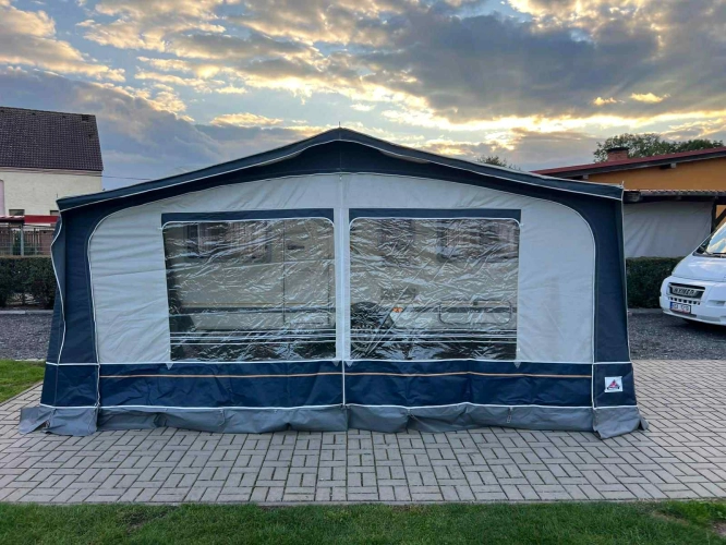 Rozložitelné sezení na dvou lůžko, chemické WC, odtoková vanička, umyvadlo, Tří plotýnkový vařič + dřez, Lednice 220V, 12V, plyn, Plynové topení trumatic, rozfuk, thermorolety v oknech, sítě proti hmyzu, druhé rozložitelné sezení na další dvoulůžko do písmene U, před stan, stabilizátor, stojan na dvě jízdní kola, bojler a mnoho úložného prostoru.