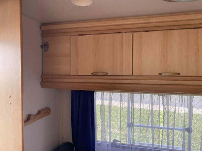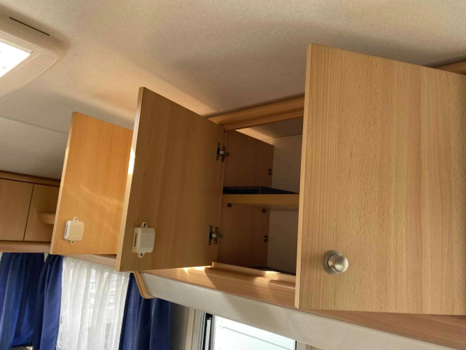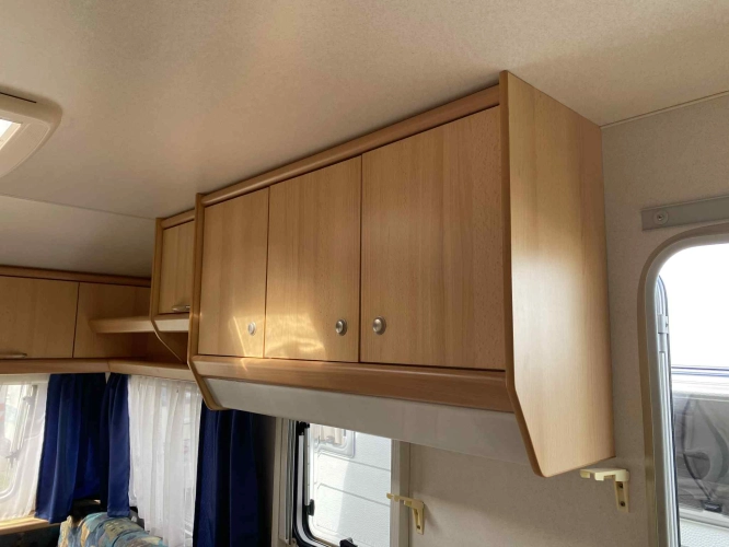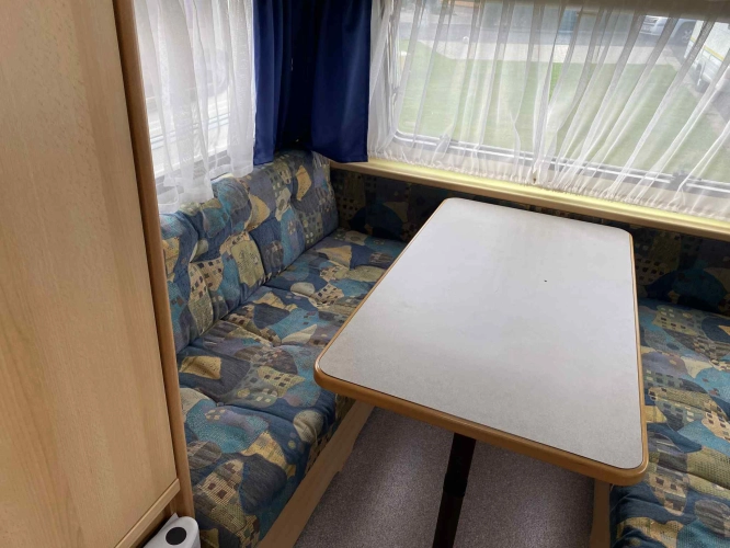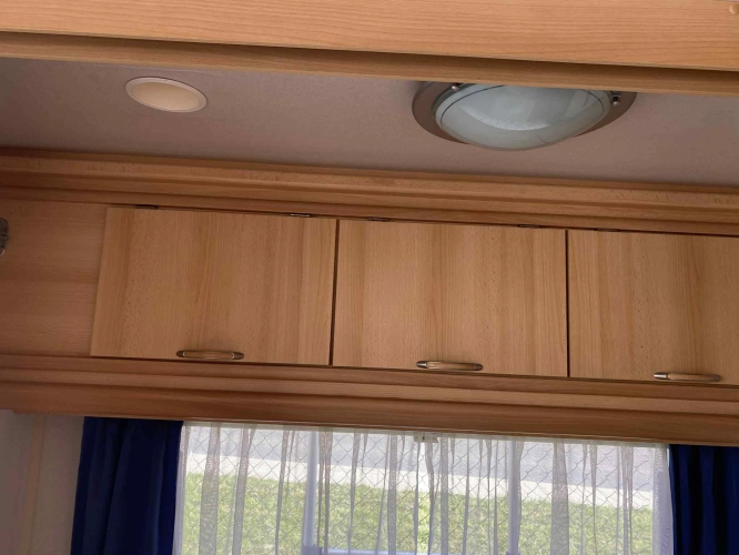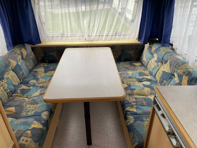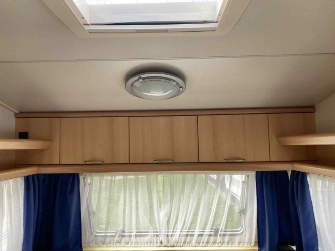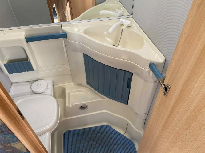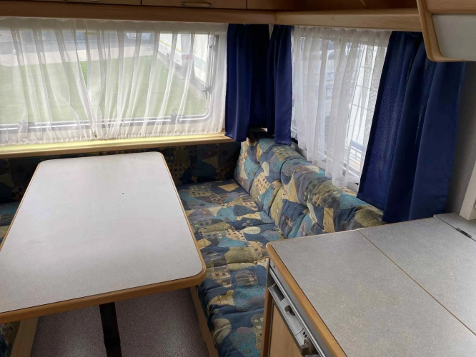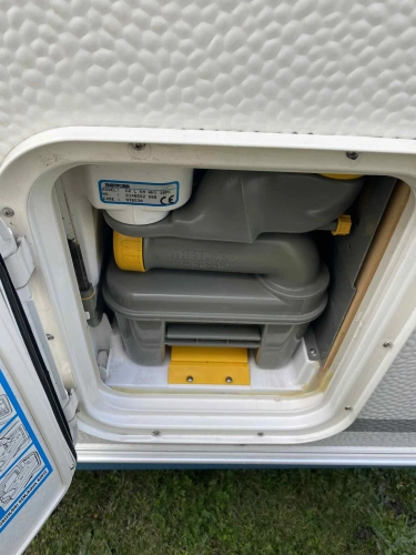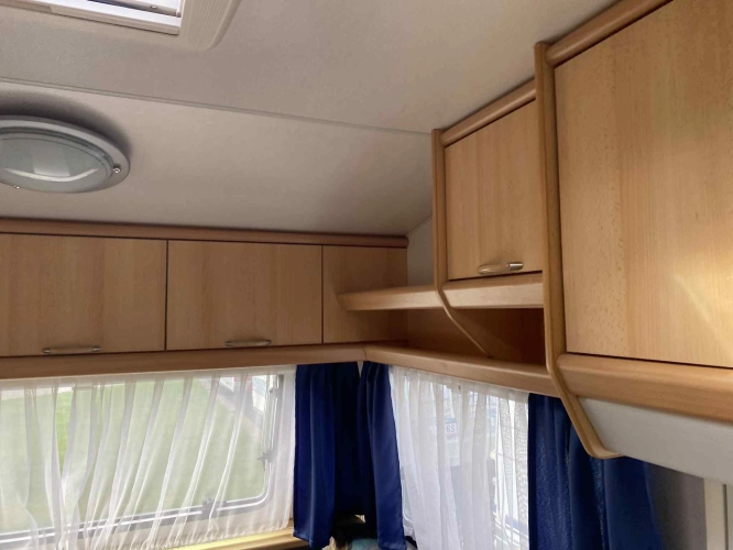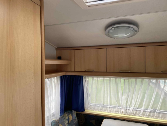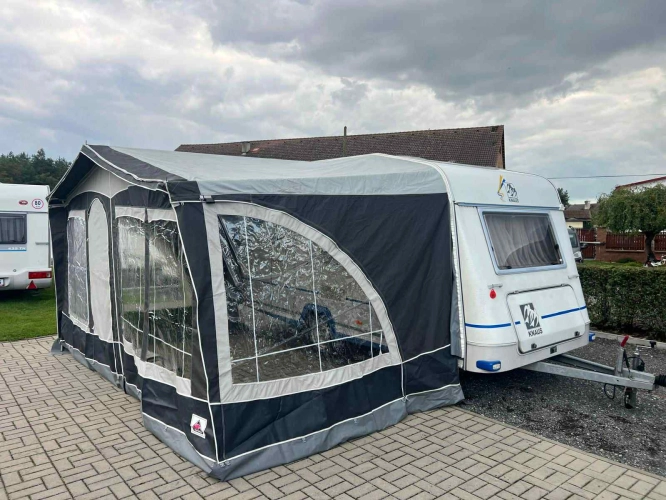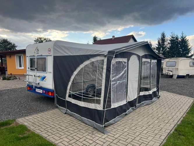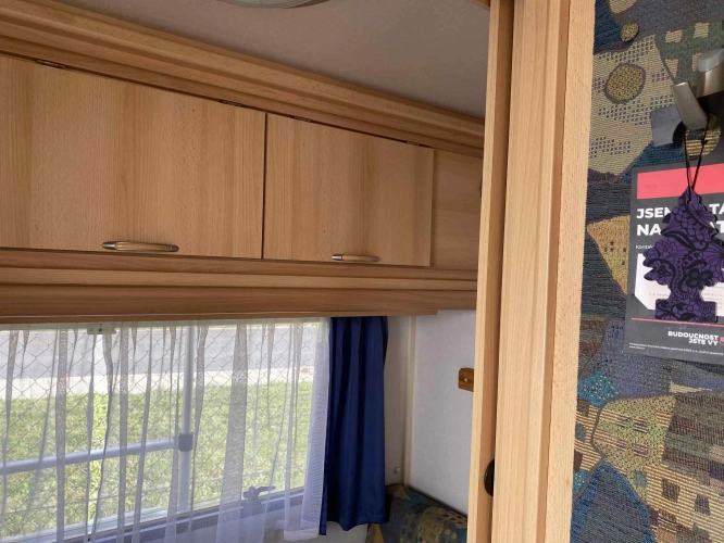 Rozložitelné sezení na dvoulůžko, chemické WC, odtoková vanička, umyvadlo, zrcadlo, tří plotýnkový vařič + dřez, Lednice 220V, plyn, plynové topení trumatic, druhé rozložitelné sezení, rychlost 100 km/h,sítě proti hmyzu, thermo rolety, předstan, stojan na dvě jízdní kola, mnoho úložného prostoru.