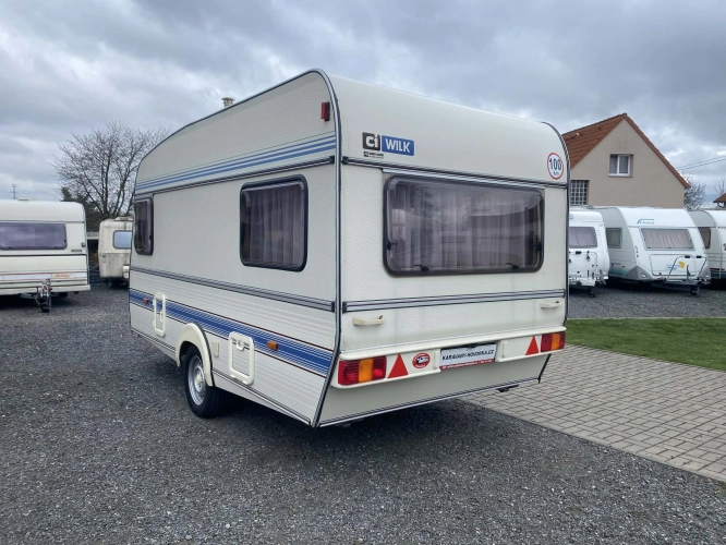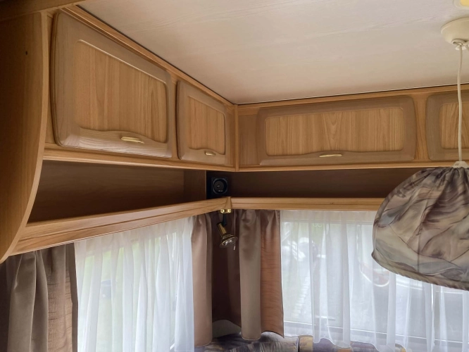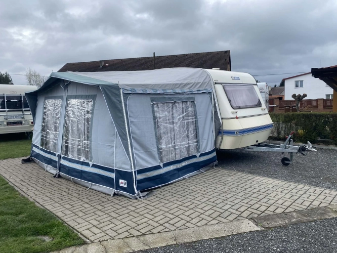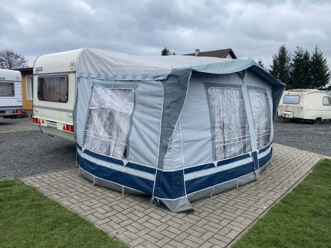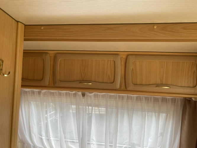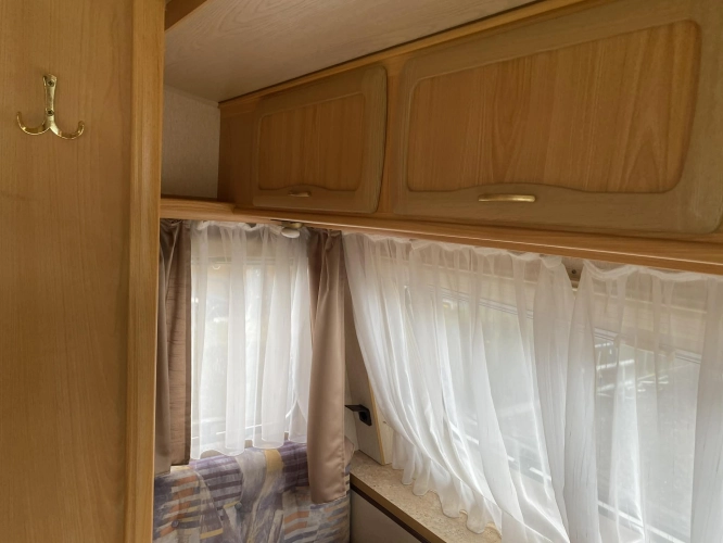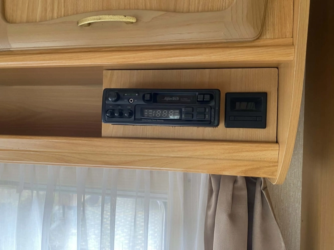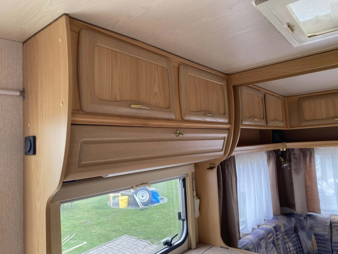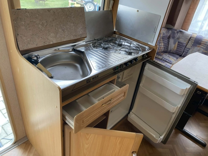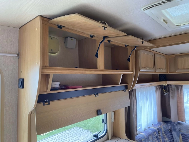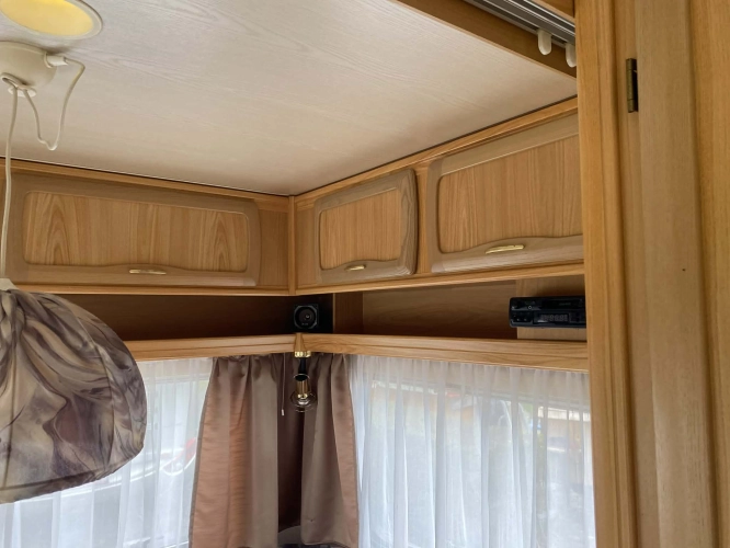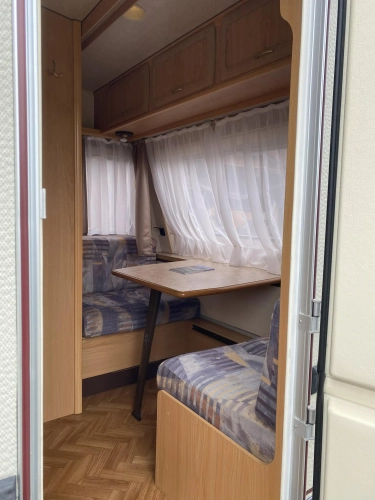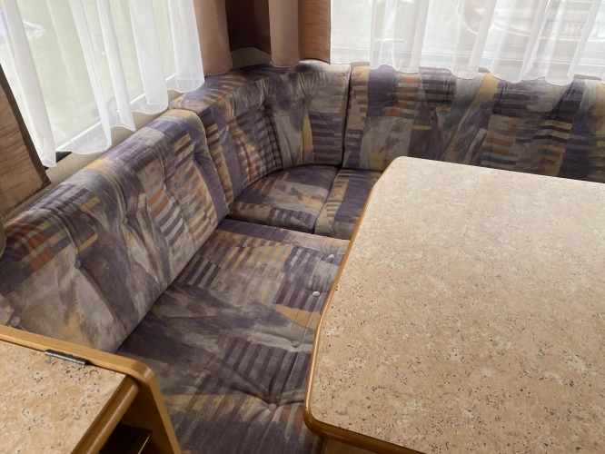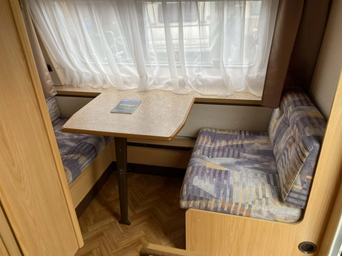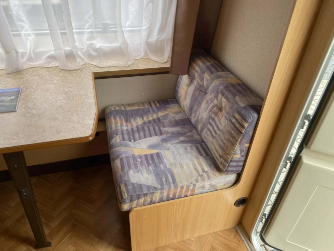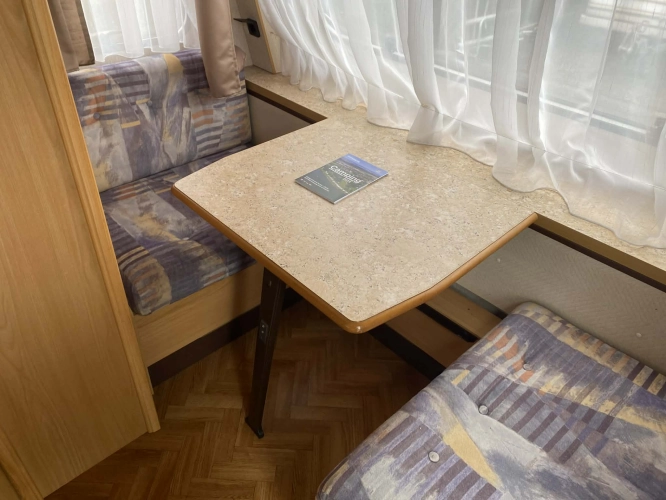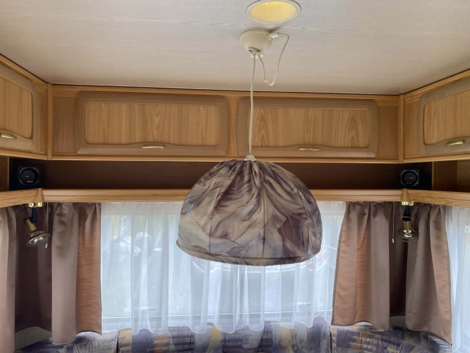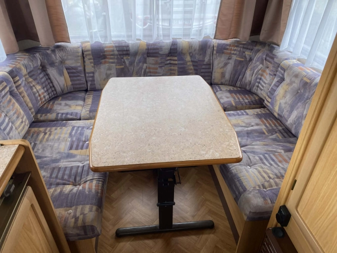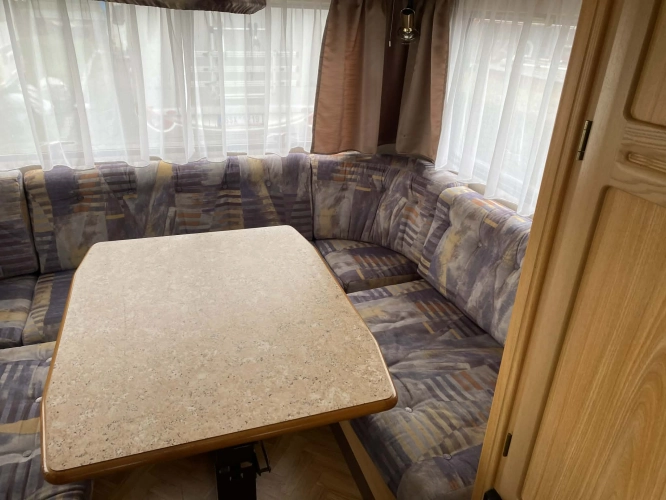 Rozložitelné sezení na dvoulůžko do písmene U, koupelna s chemickým wc odtoková vanička, umyvadlo a zrcadla, nerezový dřez, plynový tří plotýnkový sporák, lednice, druhé rozložitelné sezení, plynový topení Trumatic, závěsy, záclony, sítě proti hmyzu a thermo rolety v oknech, radio a po celém karavanu mnoho úložného prostoru, předstan.