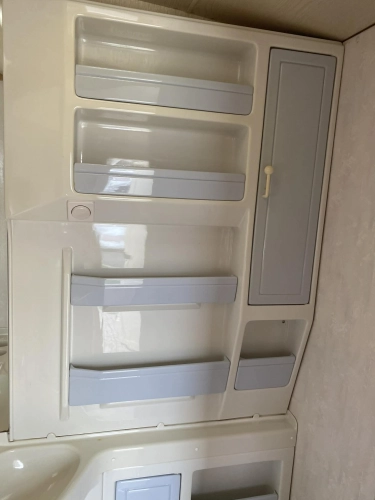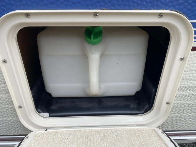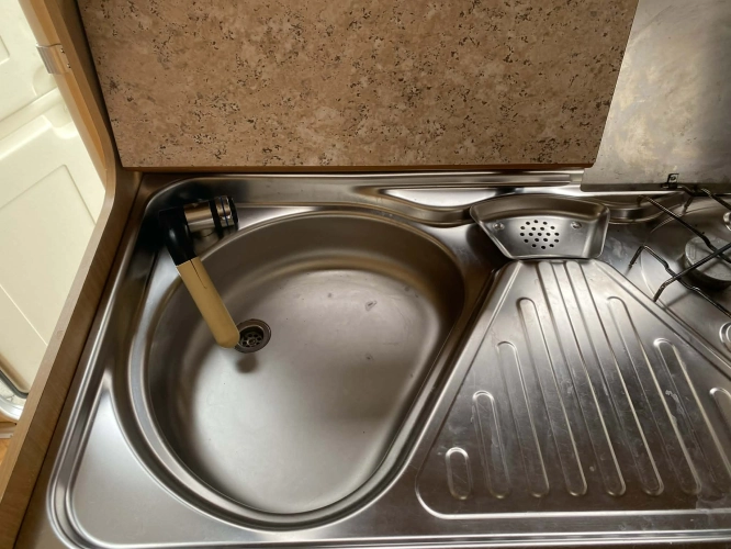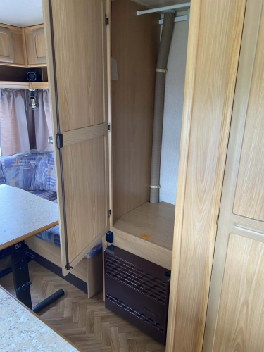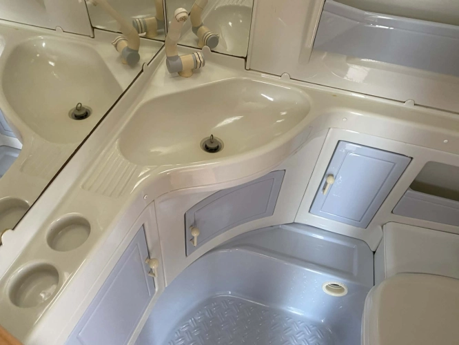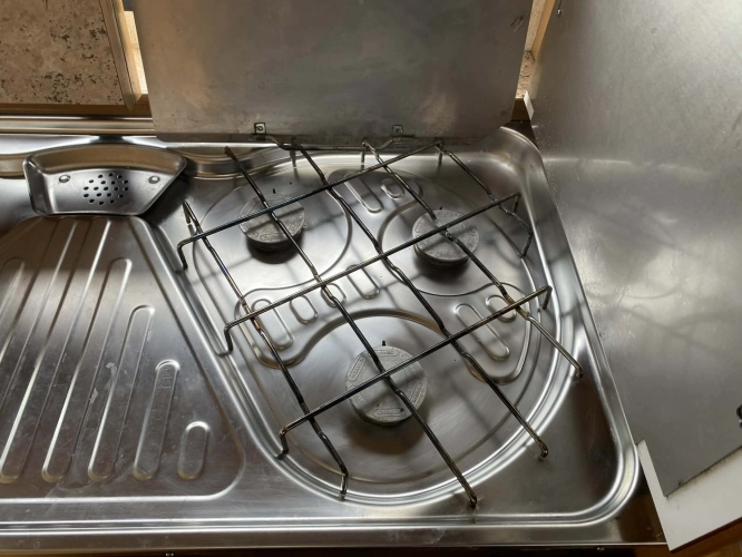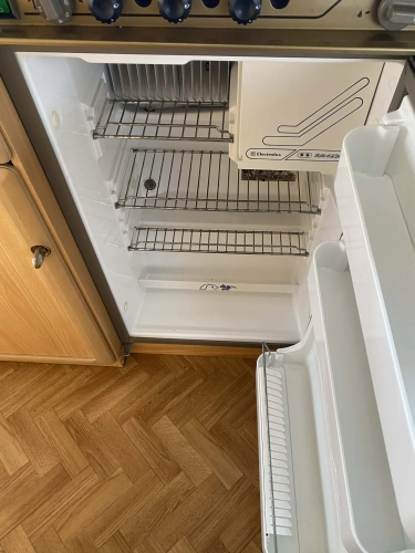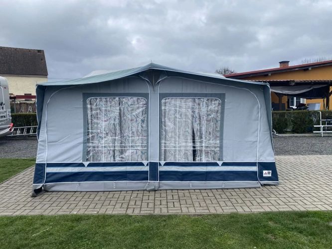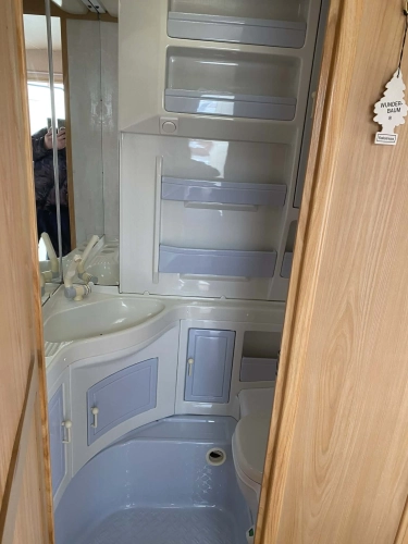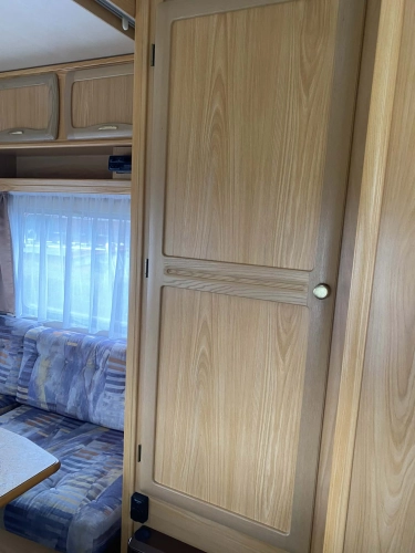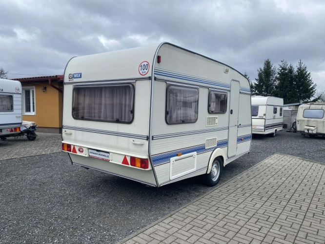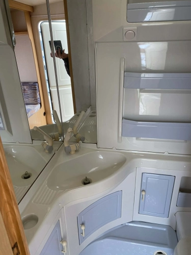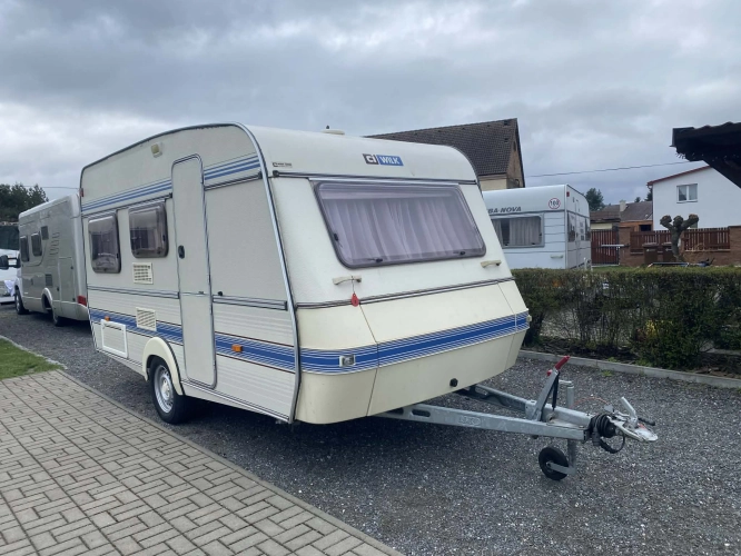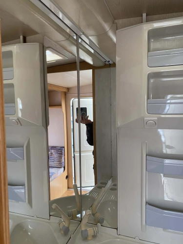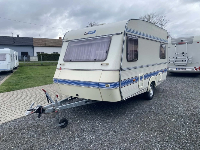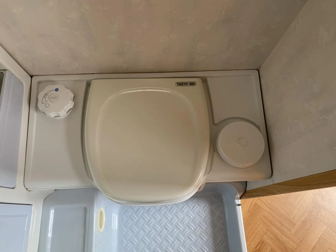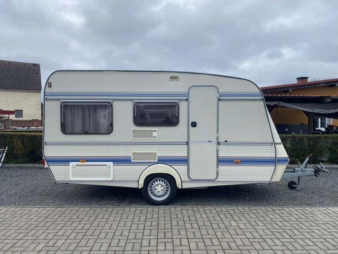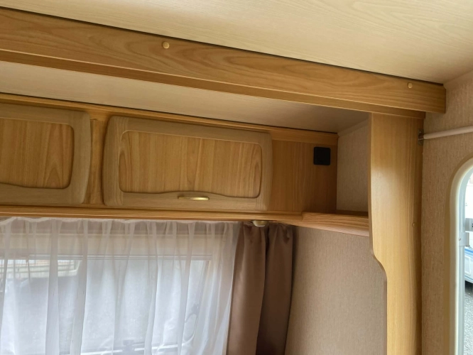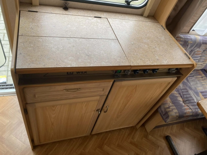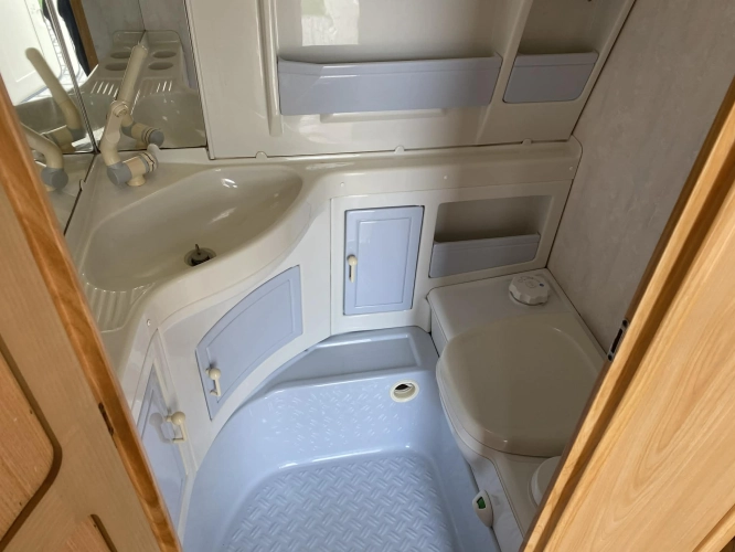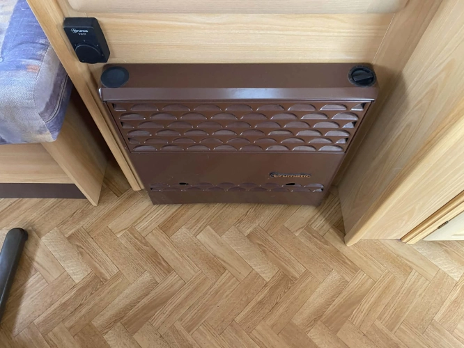 Rozložitelné sezení na dvoulůžko do písmene U, koupelna s chemickým wc odtoková vanička, umyvadlo a zrcadla, nerezový dřez, plynový tří plotýnkový sporák, lednice, druhé rozložitelné sezení, plynový topení Trumatic, závěsy, záclony, sítě proti hmyzu a thermo rolety v oknech, radio a po celém karavanu mnoho úložného prostoru, předstan.